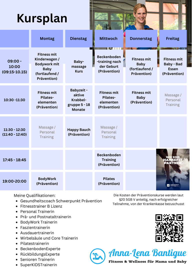 Sei es Entspannung während einer Schwangerschaftsmassage, eine gemeinsame Babymassage oder Rückbildung nach der Schwangerschaft sowie Fitnesskurse, bei denen du dich gemeinsam mit deinem Baby stärken kannst und wieder fit wirst.